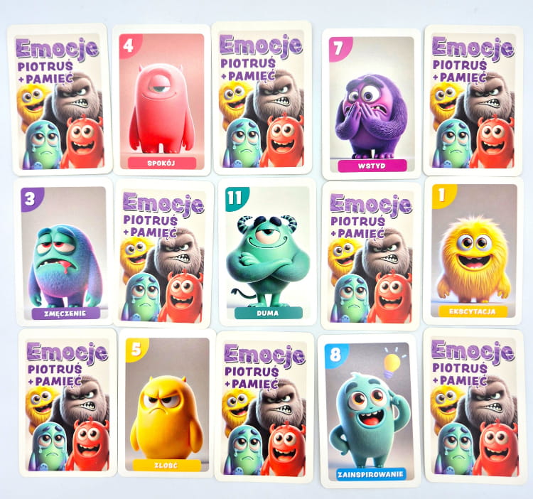 Zestaw zawiera 25 kart z wizerunkami zabawnych stworków będących personifikacją 13 różnych emocji.