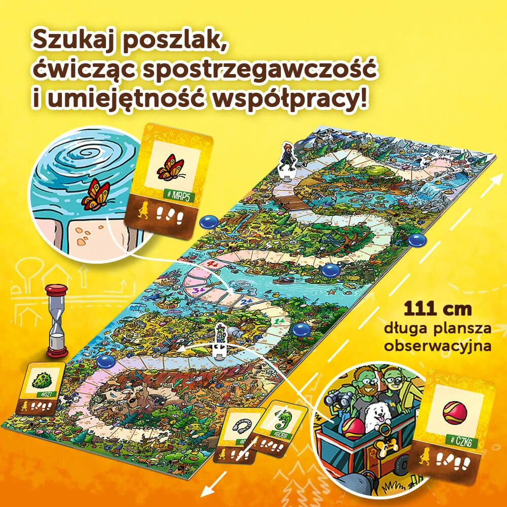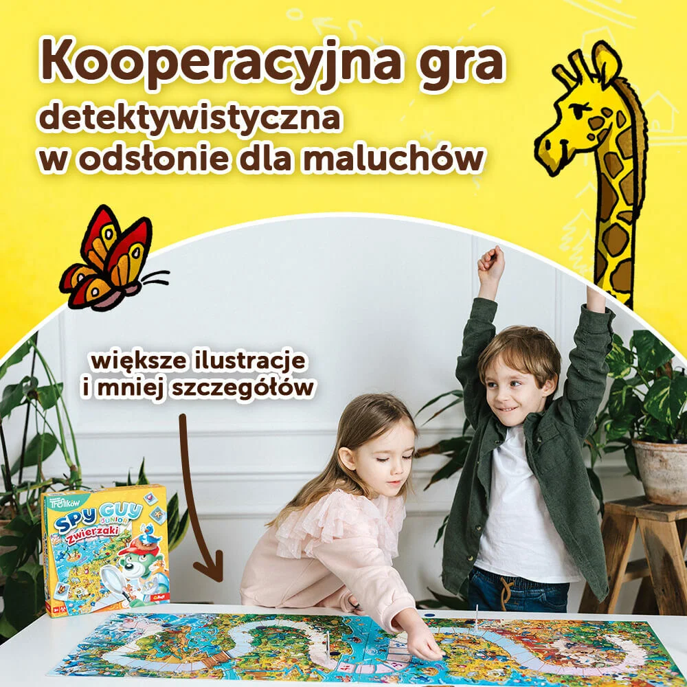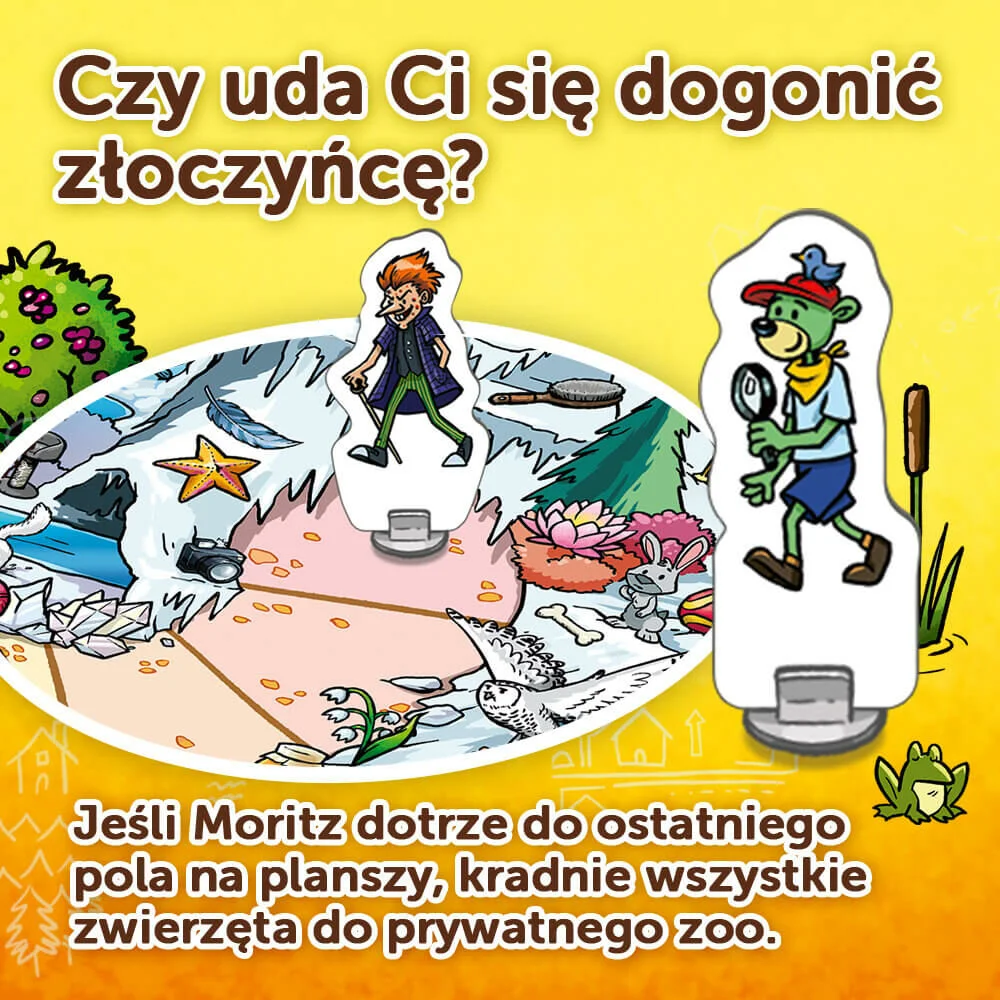 Spy Guy Junior Zwierzaki to kooperacyjna gra, w której wcielacie się w rolę młodego detektywa i próbujecie schwytać złoczyńcę, nim ten złapie wszystkie zwierzaki świata i zamknie je w swoim prywatnym zoo. Ćwiczcie spostrzegawczość, umiejętność skupienia uwagi i współpracy, poszukując poszlak na barwnej, rysunkowej ponadmetrowej planszy.