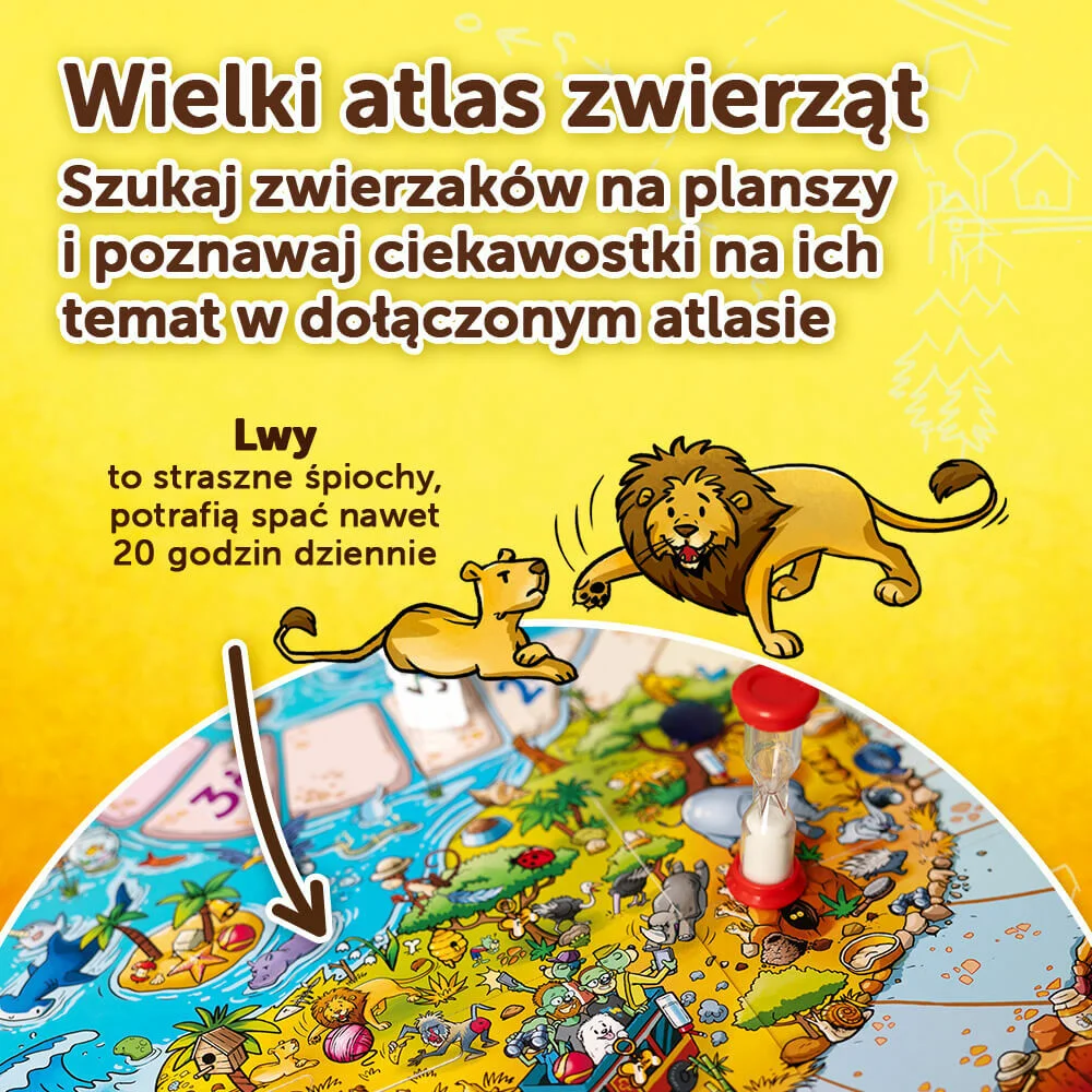 Dodatkowo w opakowaniu znajdziecie atlas ze wszystkimi zwierzętami występującymi na planszy. Spróbujcie odnaleźć je wszystkie i zapoznajcie się z ciekawostkami na ich temat.