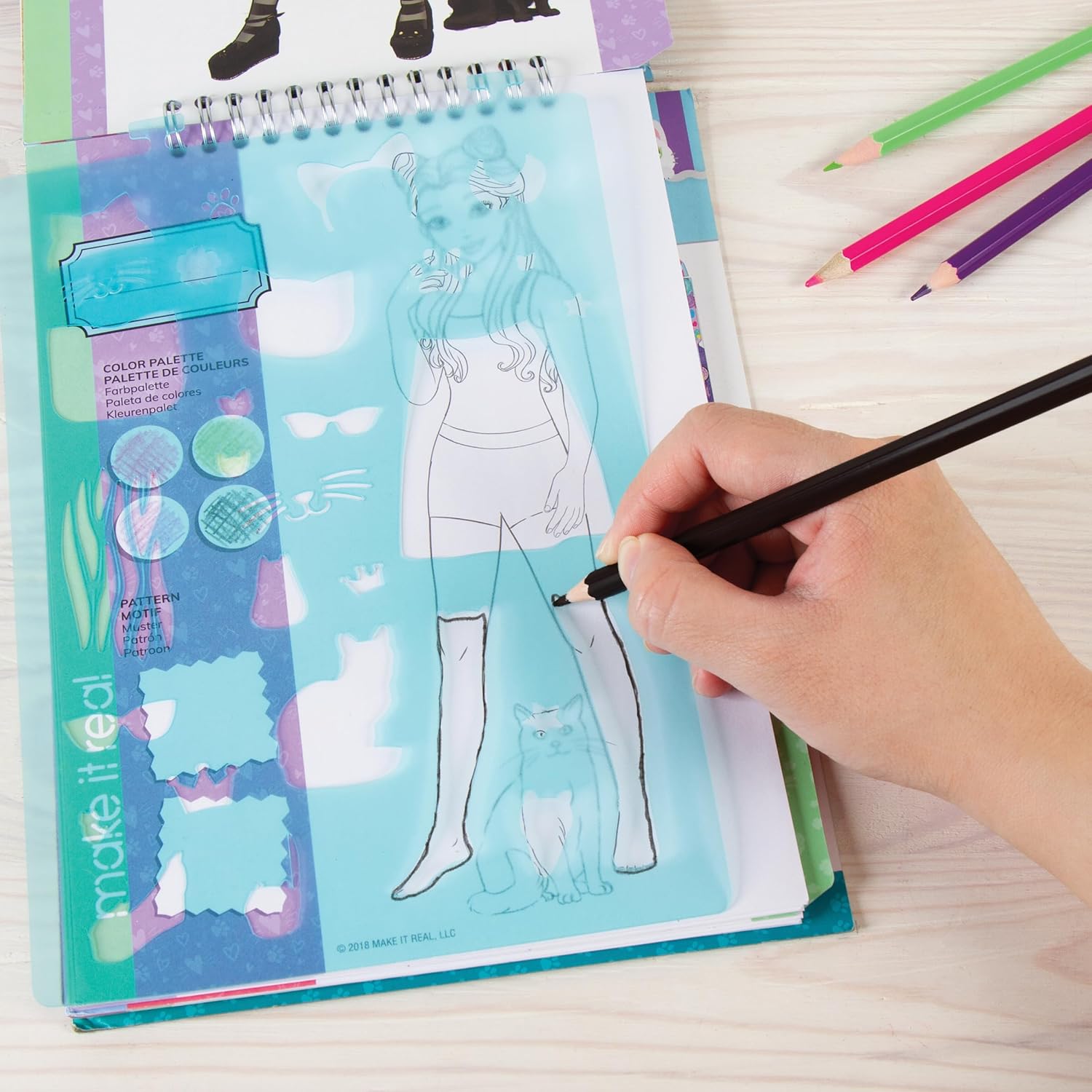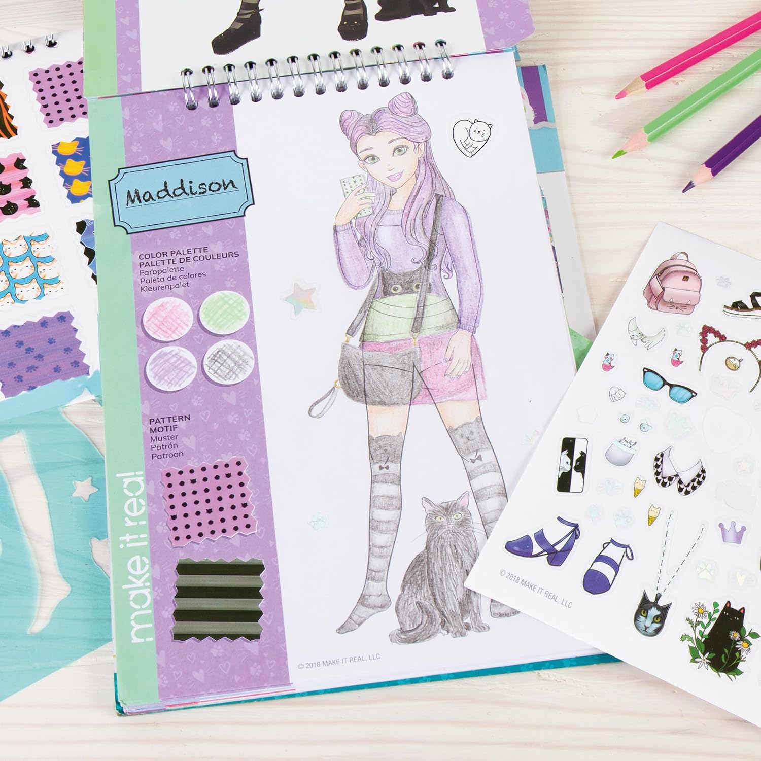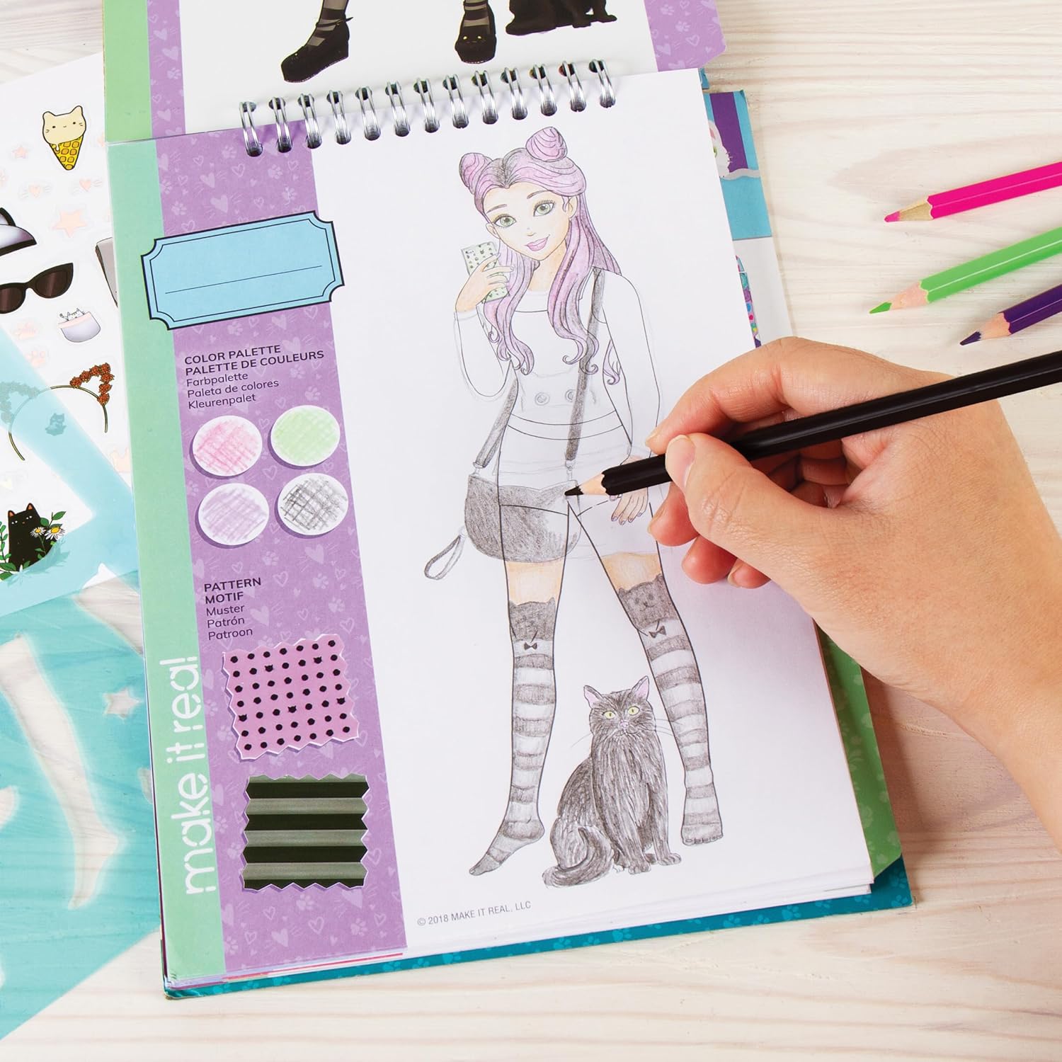 Szkicownik zawiera absolutnie wszystko aby móc rozpocząć wielkie projektowanie - od szablonów i kolorowanek, po pełny przewodnik projektowania i mnóstwo naklejek z akcesoriami.