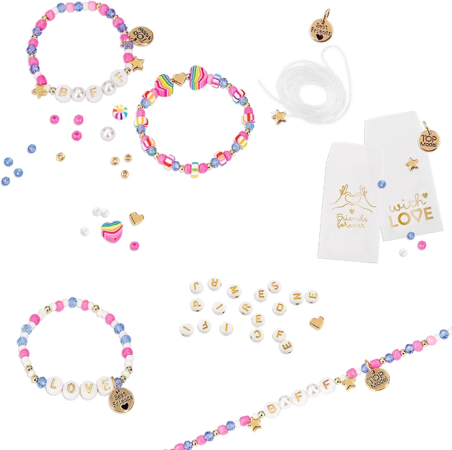 ✅ W zestawie: różnorodne koraliki min. z literkami, w kształcie serca okrągłe kolorowe, elastyczna żyłka do cięcia, 6 mini zawieszek (3 rodzaje po 2 sztuki).